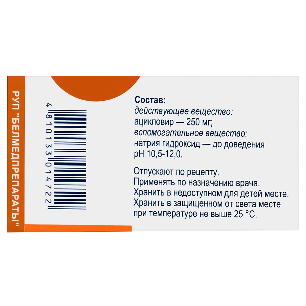 Активное вещество: ацикловир 0,25 г, 0,5 г, 1,0 г вспомогательное вещество: натрия гидроксид.
