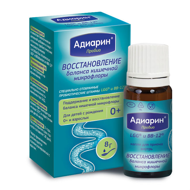 Адиарин Пробио рекомендуется в качестве биологически активной добавки к пище – источника пробиотических микроорганизмов Lactobacillus rhamnosus LGG и Bifidobacterium BB-12: