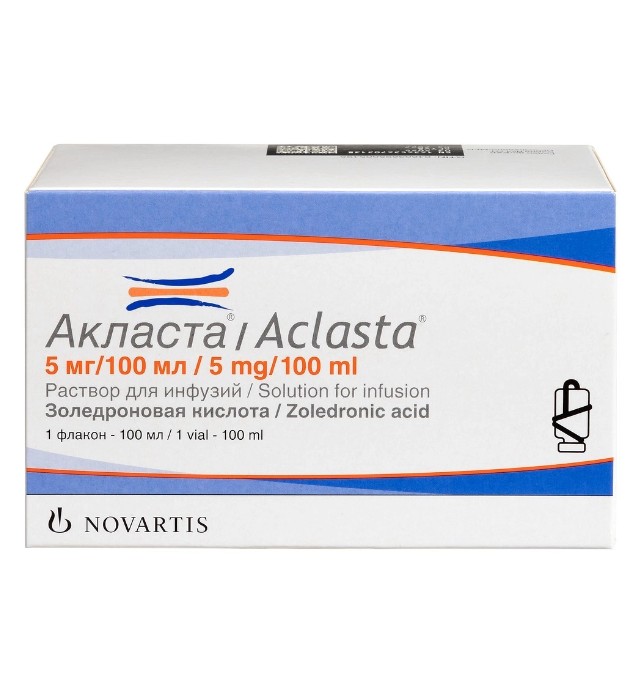 Для лечения постменопаузального остеопороза у женщин и остеопороза у мужчин рекомендуемая доза препарата Акласта составляет 5 мг (содержимое одного флакона препарата — 100 мл раствора) внутривенно 1 раз в год. Если поступление в организм кальция и витамина D с пищей недостаточно, пациентам следует дополнительно назначить препараты кальция и витамина D.