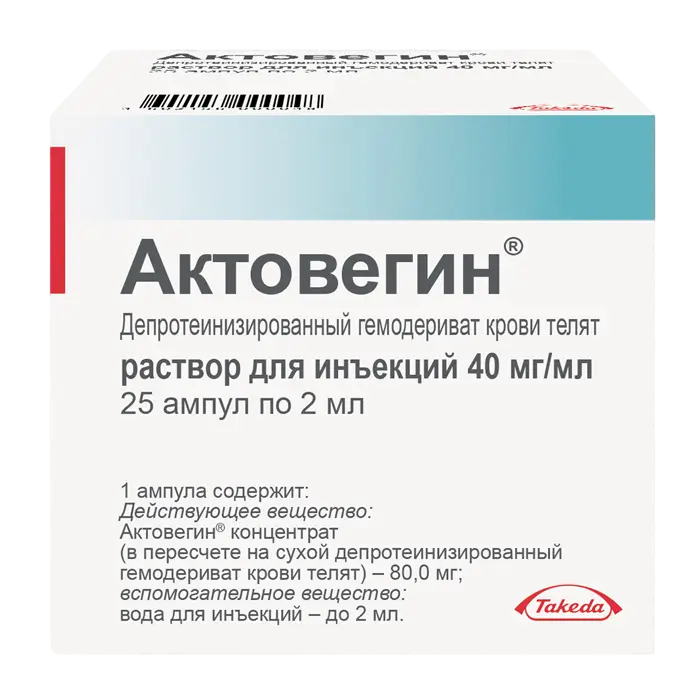 Для ампул объёмом 2 мл: 1 ампула содержит: действующее вещество: Актовегин® концентрат (в пересчёте на сухой депротеинизированный гемодериват крови телят)1) — 80,0 мг вспомогательное вещество: вода для инъекций — до 2 мл.