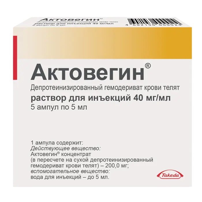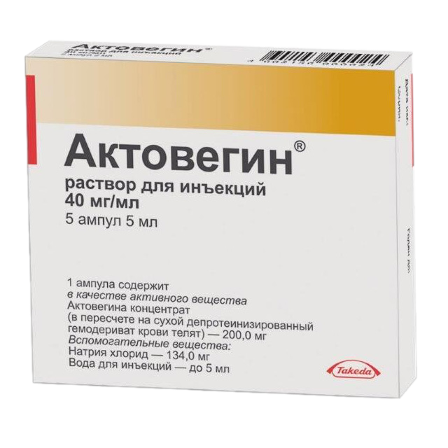 Для ампул объёмом 5 мл: 1 ампула содержит: действующее вещество: Актовегин® концентрат (в пересчёте на сухой депротеинизированный гемодериват крови телят)1) 200,0 мг вспомогательное вещество: вода для инъекций — до 5 мл.