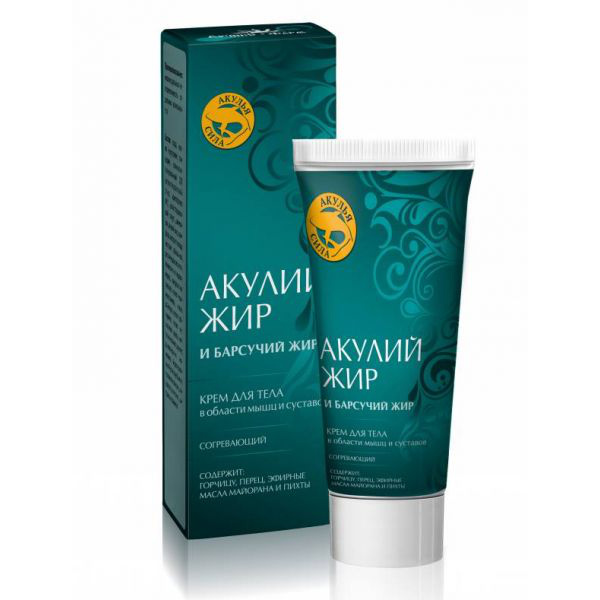 Акулий жир и барсучий жир -крем для тела в области мышц и суставов согревающий.Барсучий жир -натуральное , высокоэффективное лечебно-профилактическое средство. Благодаря содержанию витаминов и микроэлементов, необходимых для питания околосуставных мышц и соединительных тканей-его используют при лечении дегенеративно-дистрофических заболеваний опорно-двигательного аппарата , мышечных болях,судорогах, невритах,невралгиях, растяжениях связок.