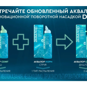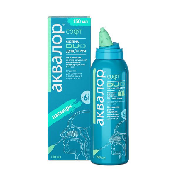 | Описание устройства изделия | Средство для орошения и промывания полости носа для детей и взрослых в вариантах исполнения «Аквалор® софт мини» 50 мл «Аквалор® софт» 150 мл по ТУ 32.50.50-008-00480081-2017 (далее по тексту средство) представляет собой аэрозоль в алюминиевом баллоне под давлением c: полиэтиленовой анатомической насадкой для носа, создающей распыление «душ», с ограничительным кольцом и с полипропиленовым колпачком или полиэтиленовой поворотной анатомической насадкой для носа, создающей распыление «душ / струя», с ограничительным кольцом и с полипропиленовым колпачком. Инновационная поворотная насадка позволяет выбрать требуемый тип распыления «душ» или «струя». Средство для орошения и промывания полости носа для детей и взрослых в варианте исполнения «Аквалор® норм» 150 мл по ТУ 32.50.50-008-00480081-2017 (далее по тексту средство) представляет собой аэрозоль в алюминиевом баллоне под давлением с полиэтиленовой анатомической насадкой для носа, создающей распыление «струя», с ограничительным кольцом и с полипропиленовым колпачком. Внутрь баллона помещен четырехслойный пакет с содержимым, снабженный специальным односторонним клапаном. Насадка имеет перемычку для контроля нажатия на аэрозольный клапан. Не является лекарственным средством. |