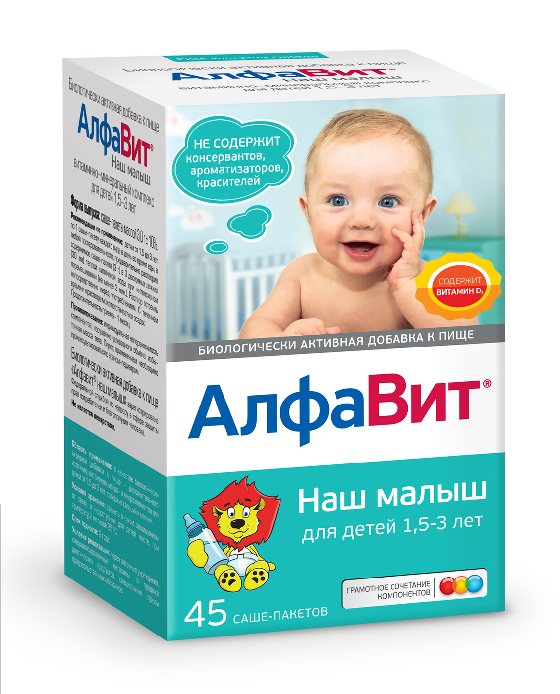 Еще одно важное качество, которым должны обладать витамины для детей в возрасте 1,5–3 лет – это гипоаллергенность. Поэтому в составе АЛФАВИТА Наш малыш отсутствуют красители, консерванты и ароматизаторы, а полезные вещества представлены в их неаллергенных формах (например, витамин А заменен на его безопасный предшественник – бета-каротин).