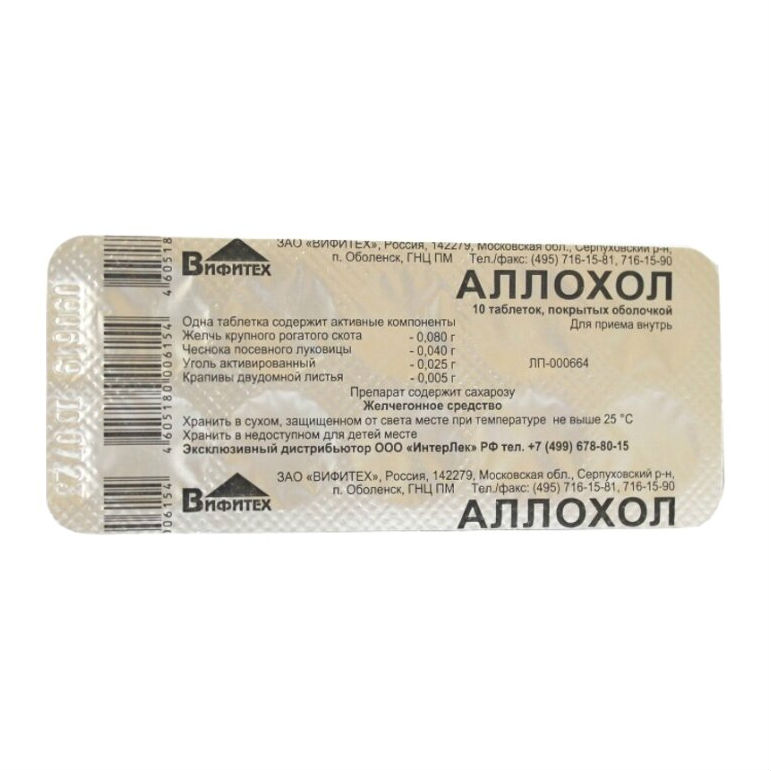 Действующие вещества: Желчь (Желчь крупного рогатого скота сухая) - 80,000 мг, чеснока посевного луковицы - 40,000 мг, активированный уголь (Уголь активированный) - 25,000 мг, крапивы двудомной листья - 5,000 мг.