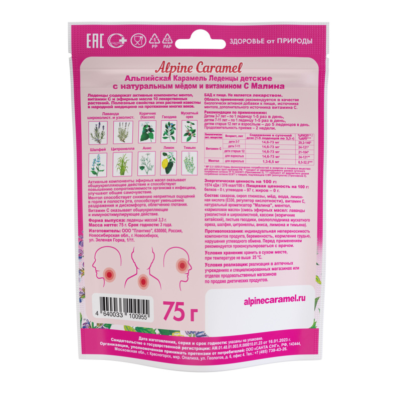 Леденцы Alpine Caramel Альпийская Карамельсодержат кармоловое масло (комплекс эфирных масел десяти лекарственных растений), витамин С и натуральный мед. Полезные свойства входящих в состав лекарственных растений известны на протяжении многих веков. Состав проверен временем и подбирался с учетом синергии компонентов, когда в комплексе они дополняют и усиливают действие друг друга. Комплекс эфирных масел обладает антисептическим, противомикробным, противовирусным, иммуностимулирующим и общеукрепляющим действием. Натуральный ароматизатор из сока малины смягчает вкус эфирных масел. Рекомендованы детям от 3 лет и старше. Дополнительный источник витамина С. Могут использоваться для облегчения симптомов укачивания в транспорте.