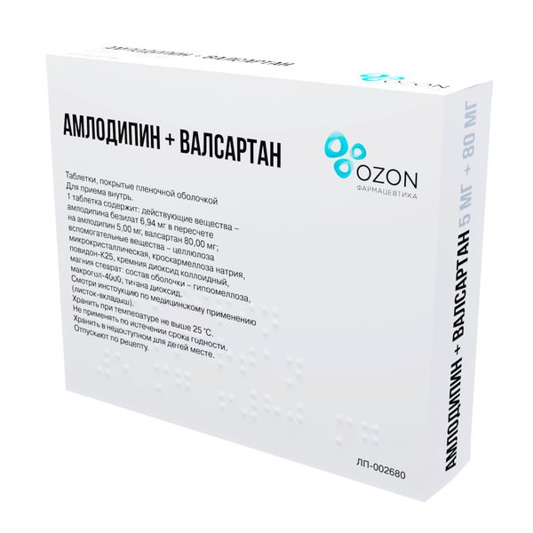 Активные вещества: амлодипина безилат — 6,94 мг в пересчёте на амлодипин — 5,00 мг, валсартан — 80,00 мг.
