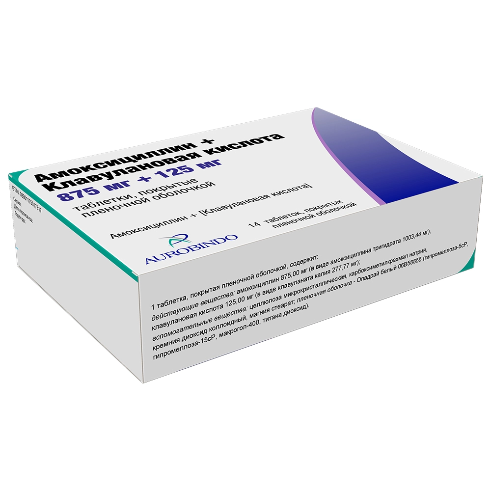 Амоксициллин+Клавулановая кислота таблетки покрытые пленочной оболочкой 875мг+125мг №14