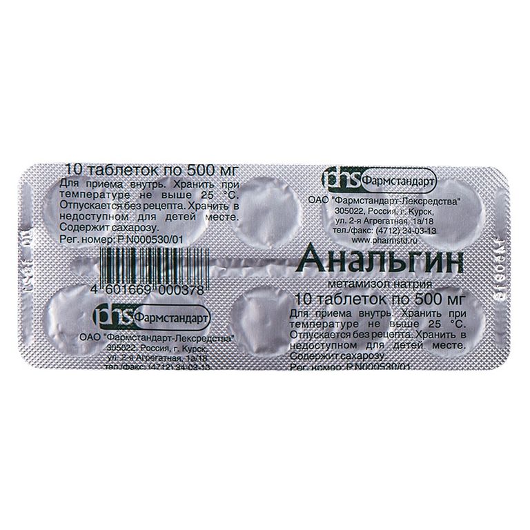 Активное вещество: метамизол натрия (анальгин) — 0,5 г.