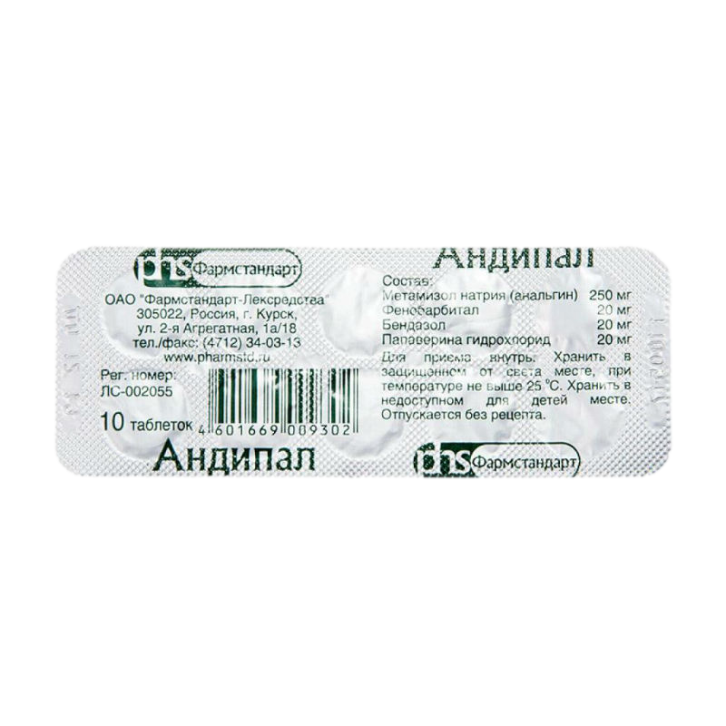 Активные вещества: метамизол натрия (анальгин) — 250 мг фенобарбитал — 20 мг, бендазол — 20 мг папаверина гидрохлорид — 20 мг.