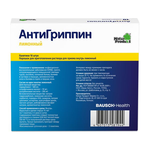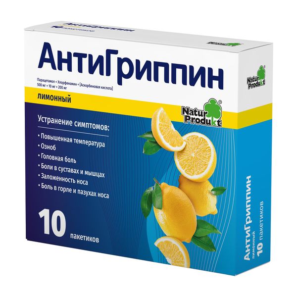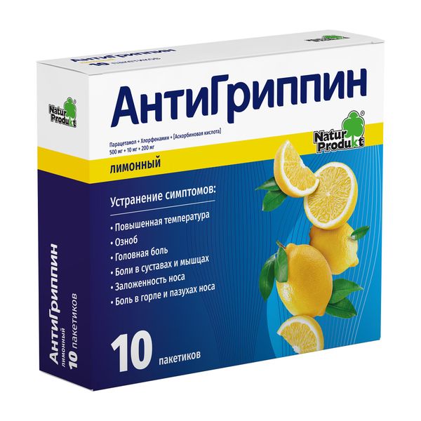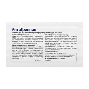 Антигриппин порошок для приготовления раствора для приема внутрь лимонный пакетики 5г №10