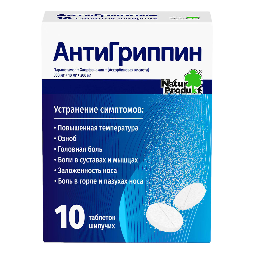 Активные вещества: парацетамол 500,00 мг, хлорфенамина малеат 10,00 мг, аскорбиновая кислота 200,00 мг.
