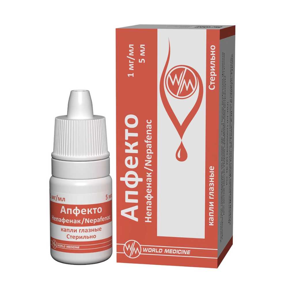 Действующим веществом препарата Апфекто является непафенак, который относится к группе средств, применяемых в офтальмологии противовоспалительных средств нестероидных противовоспалительных средств.