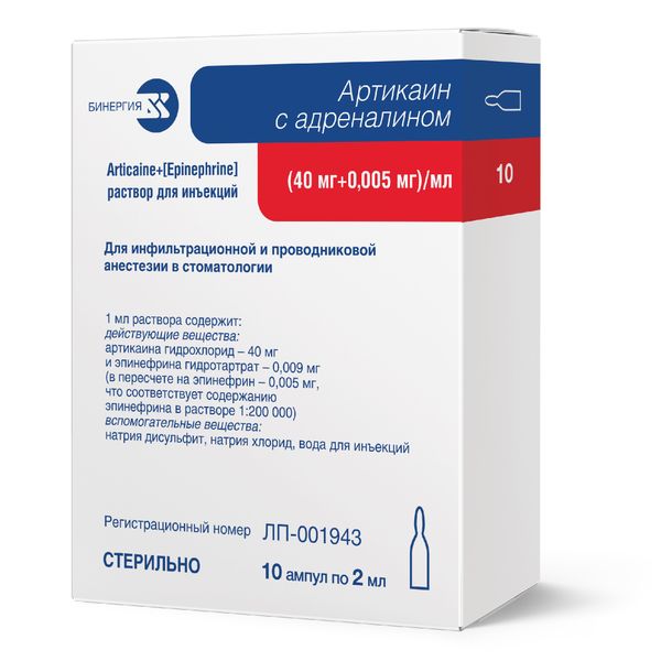 Артикаин с адреналином раствор для инъекций 40мг/мл+0,005мг/мл ампулы 2мл №10