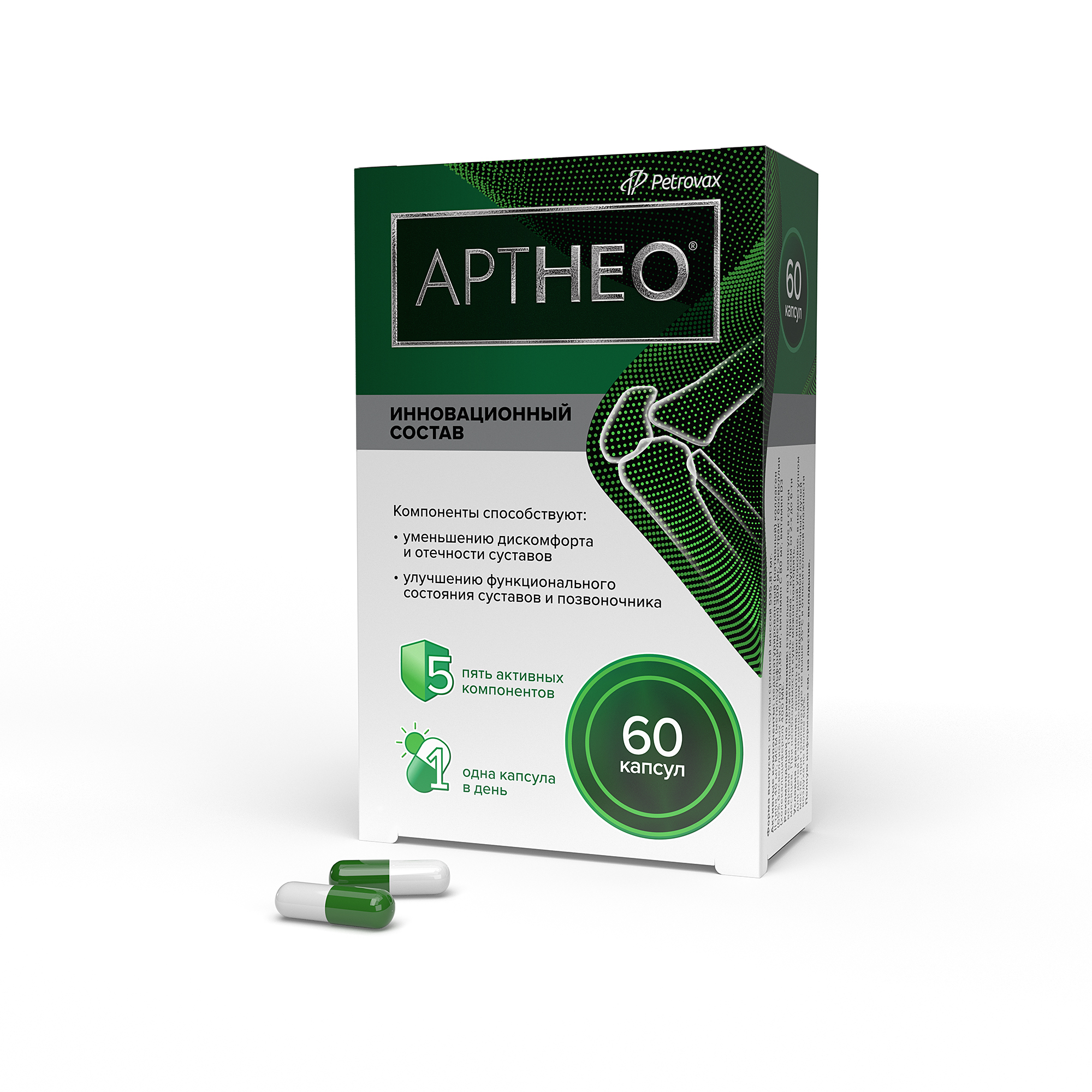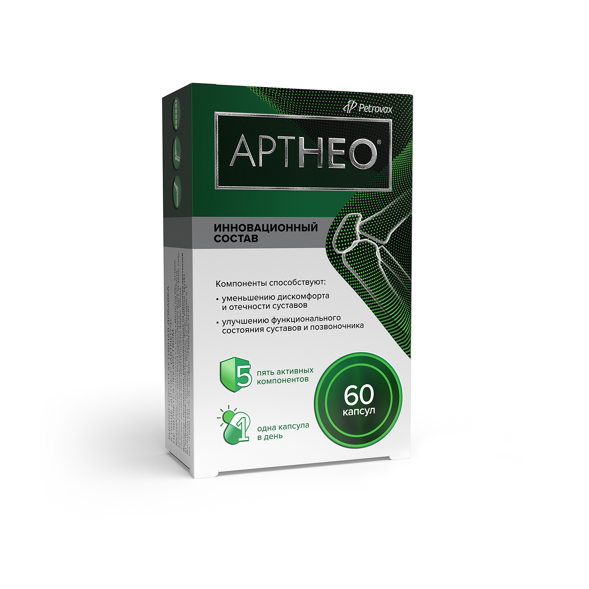 5 активных компонентов АРТНЕО® способствуют уменьшению болезненных ощущений и отечности, помогая организму восстанавливать функциональное состояние суставов и позвоночника:
