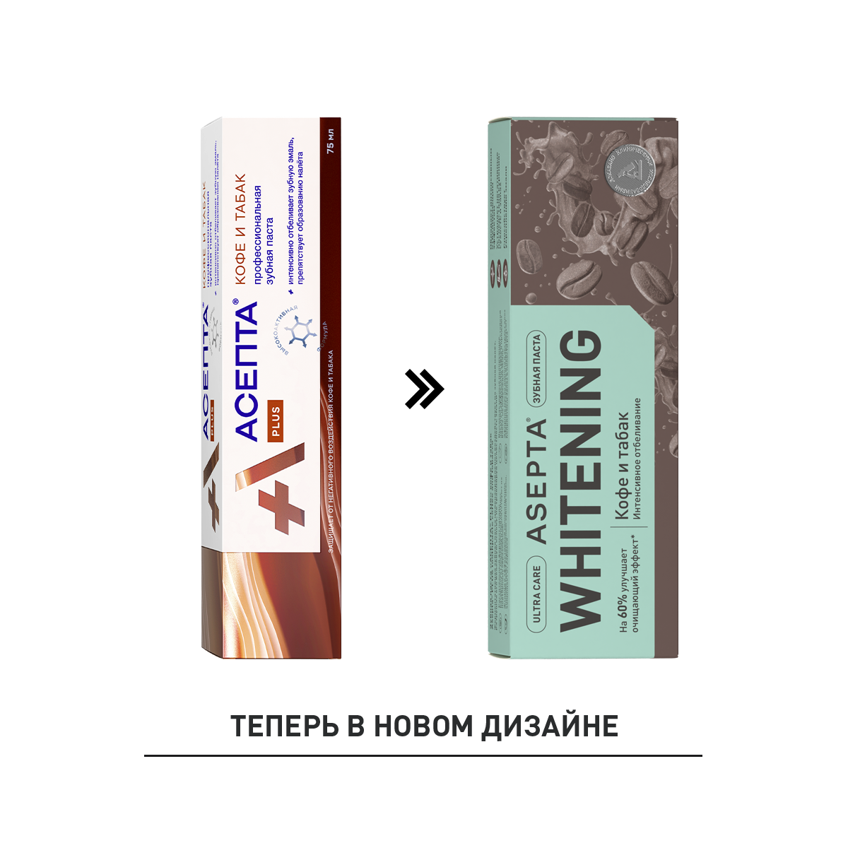 Белые зубы и здоровая слизистая без сухости и воспаления теперь доступны самому широкому кругу любителей кофе, чая, табака и красного вина. Зубная пасте Асепта Plus Кофе и табак заботится о здоровье десен и эффективно осветляет эмаль зубов каждый день, поэтому даже при регулярном употреблении красящих продуктов зубы сохраняют привлекательный природный оттенок, а слизистая полости рта восстанавливается быстрее и не страдает от сухости.