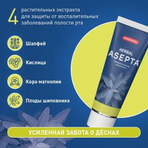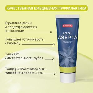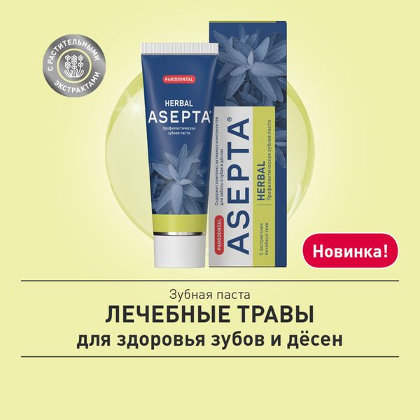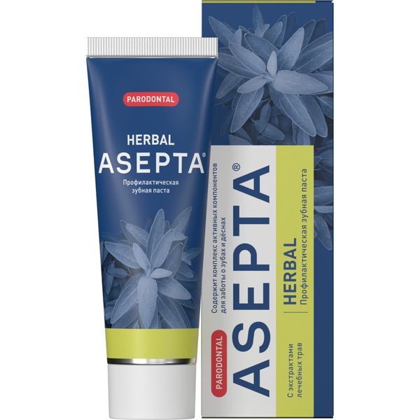 Зубная паста «ASEPTA» Лечебные травы – это профилактическое средство для ухода за полостью рта, содержащее экстракты лечебных трав и специализированную ферментативную систему для борьбы с зубным налетом. Она обеспечивает надежную защиту десен и зубов, способствуя их здоровью и благополучию.