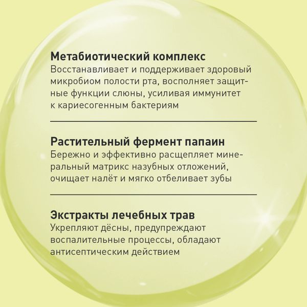 - Метабиотический комплекс: Восстанавливает и поддерживает здоровый микробиом, улучшает защитные функции слюны и усиливает иммунитет к бактериям, вызывающим кариес.