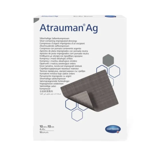 Серебросодержащая повязка с антибактериальными свойствами из полиамидной сетки, покрытой элементарным серебром. Ионы серебра подавляют жизнедеятельность бактерий в ране. Atrauman Ag воздействует как на грамотрицательные (например, Klebsiella pneumoniae), так и на грамположительные бактерии (например, Staphylococcus aureus, включая штаммы MRSA). Мазевая масса оберегает края раны и сохраняет их эластичность.