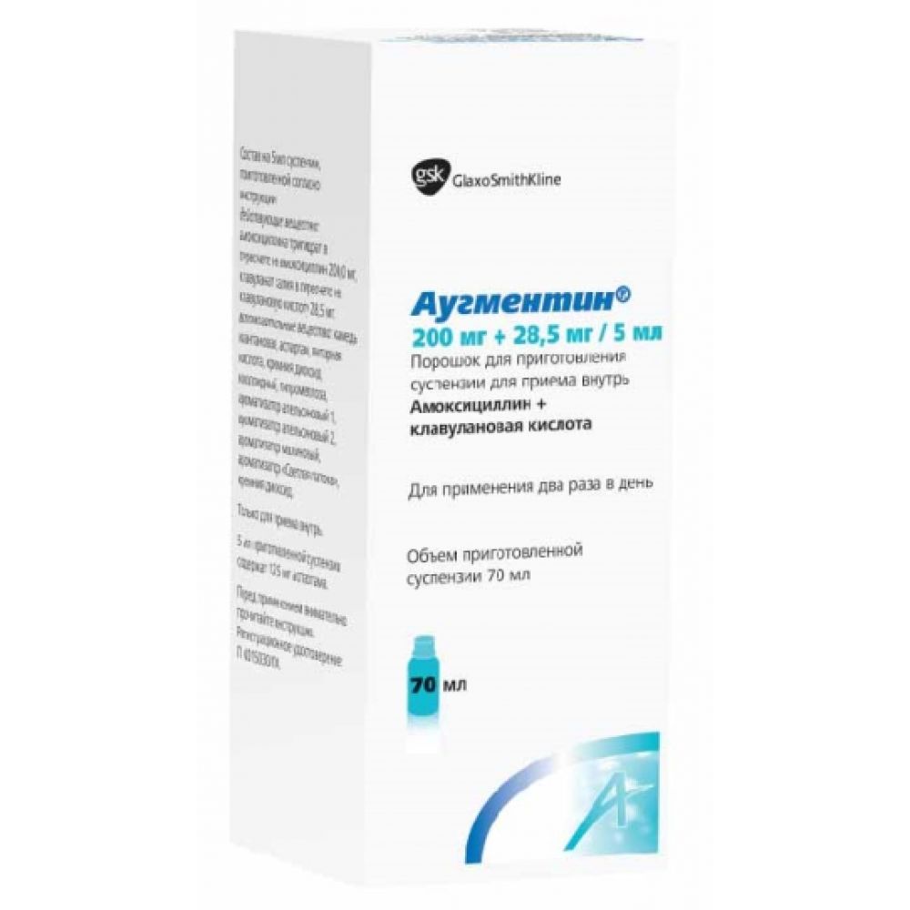 Аугментин порошок для приготовления суспензии для приёма внутрь 200мг+28,5мг/5мл флакон 70мл