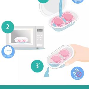 Положите в футляр хорошо промытые пустышки, добавьте 25 мл воды и поставьте его в микроволновую печь на 3 минуты при мощности 750-1000 Вт. Охладите в течение 5 минут, вылейте из футляра воду - и процесс завершен!