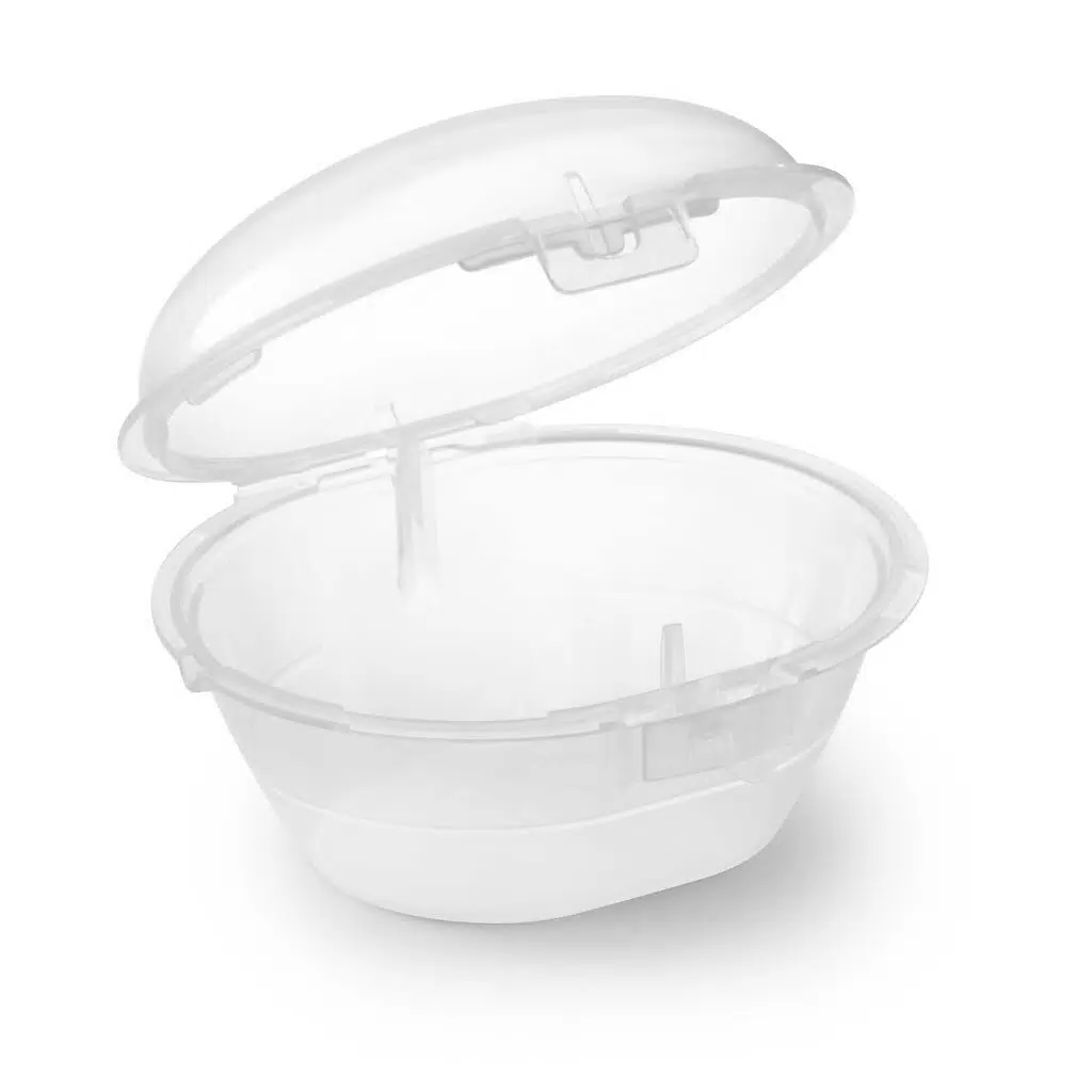 Положите в футляр хорошо промытые пустышки, добавьте 25 мл воды и поставьте его в микроволновую печь на 3 минуты при мощности 750-1000 Вт. Охладите в течение 5 минут, вылейте из футляра воду - и процесс завершен!