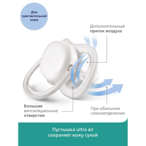 Успокойте своего малыша с помощью пустышки-соски Philips Avent ultra air SCF086/01, которая позволяет коже дышать. В комплекте 1 пустышка-соска из коллекции Philips Avent ultra air, которая разработана специально для малышей от 0 до 6 месяцев, не содержат бисфенола-А. Пустышка ultra air с приятной на ощупь соской создана для легкого и комфортного использования. Любят дети по всему миру*, 98 % опрошенных мам сказали, что ребенок легко принимает пустышки Philips Avent ultra soft и ultra air.