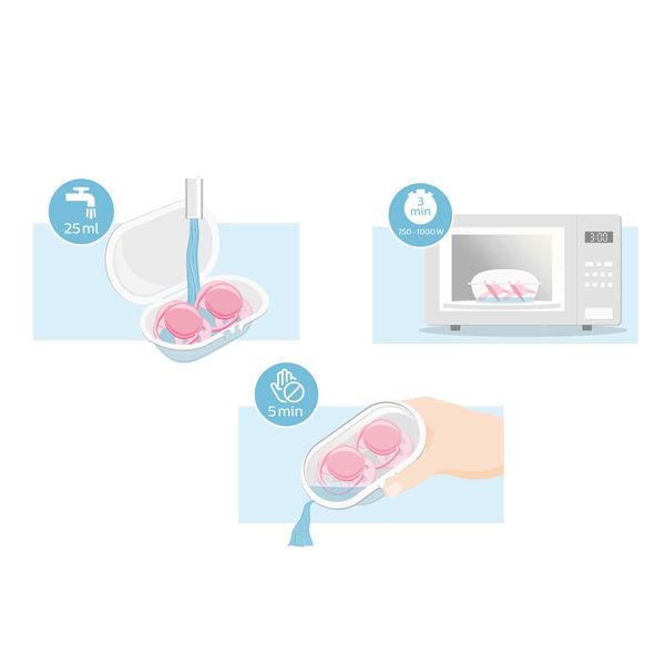 Положите в футляр хорошо промытые пустышки, добавьте 25 мл воды и поставьте его в микроволновую печь на 3 минуты при мощности 750-1000 Вт. Охладите в течение 5 минут, вылейте из футляра воду - и процесс завершен!
