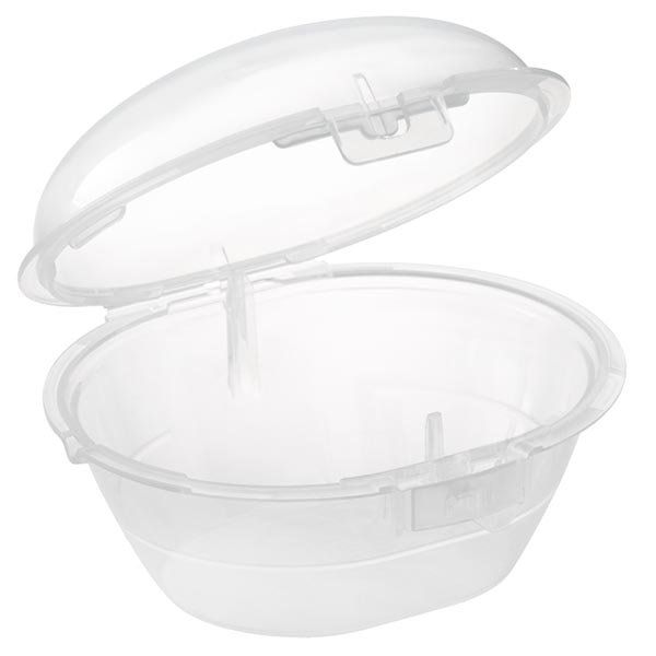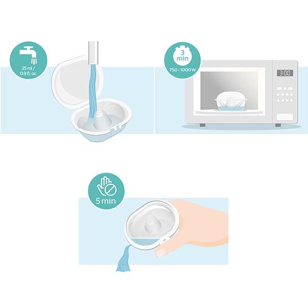 Положите в футляр хорошо промытые пустышки, добавьте 25 мл воды и поставьте его в микроволновую печь на 3 минуты при мощности 750-1000 Вт. Охладите в течение 5 минут, вылейте из футляра воду - и процесс завершен!