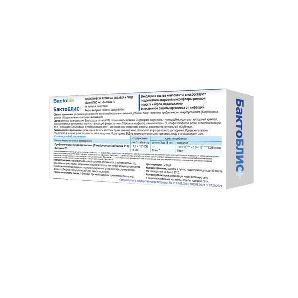 БактоБЛИС+ — продукт с натуральным составом. Входящие в состав компоненты способствуют поддержанию здоровой микрофлоры ротовой полости и горла, естественной защиты организма от инфекций.