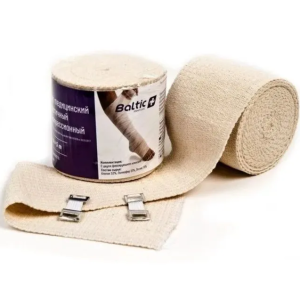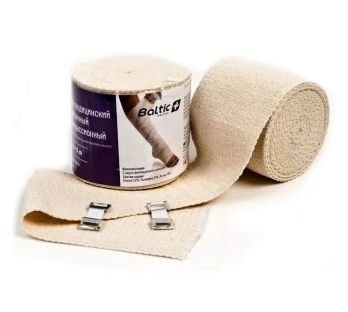 Бинт Baltic medical медицинский эластичный компрессионный СР вязаный бинт средней растяжимости (до 150%) с двумя фиксирующими клипсами. В бинте используется особое переплетение, благодаря которому с телом соприкасаются только волокна хлопка. Показатель эластичности сохраняется на протяжении многократного использования. Волокна полиэфира в сочетании с латексом обеспечивают минимальную остаточную деформацию. Специальная гофрированная поверхность предотвращает соскальзывание, придает стабильность повязке и оказывает микромассажное действие. Степень выравнивания гофры визуально показывает натяжение бинта. Специальное переплетение обеспечивает одинаковую плотность и упругость полотна по всей ширине бинта. Мягкие кромки предотвращают пережимание и натирание кожи, в то же время повязка стабильна и устойчива. Край бинта закреплен во избежание распускания.