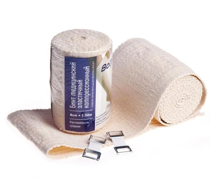 Бинт Baltic medical медицинский эластичный компрессионный СР вязаный бинт средней растяжимости (до 150%) с двумя фиксирующими клипсами. В бинте используется особое переплетение, благодаря которому с телом соприкасаются только волокна хлопка. Показатель эластичности сохраняется на протяжении многократного использования. Волокна полиэфира в сочетании с латексом обеспечивают минимальную остаточную деформацию. Специальная гофрированная поверхность предотвращает соскальзывание, придает стабильность повязке и оказывает микромассажное действие. Степень выравнивания гофры визуально показывает натяжение бинта. Специальное переплетение обеспечивает одинаковую плотность и упругость полотна по всей ширине бинта. Мягкие кромки предотвращают пережимание и натирание кожи, в то же время повязка стабильна и устойчива. Край бинта закреплен во избежание распускания.