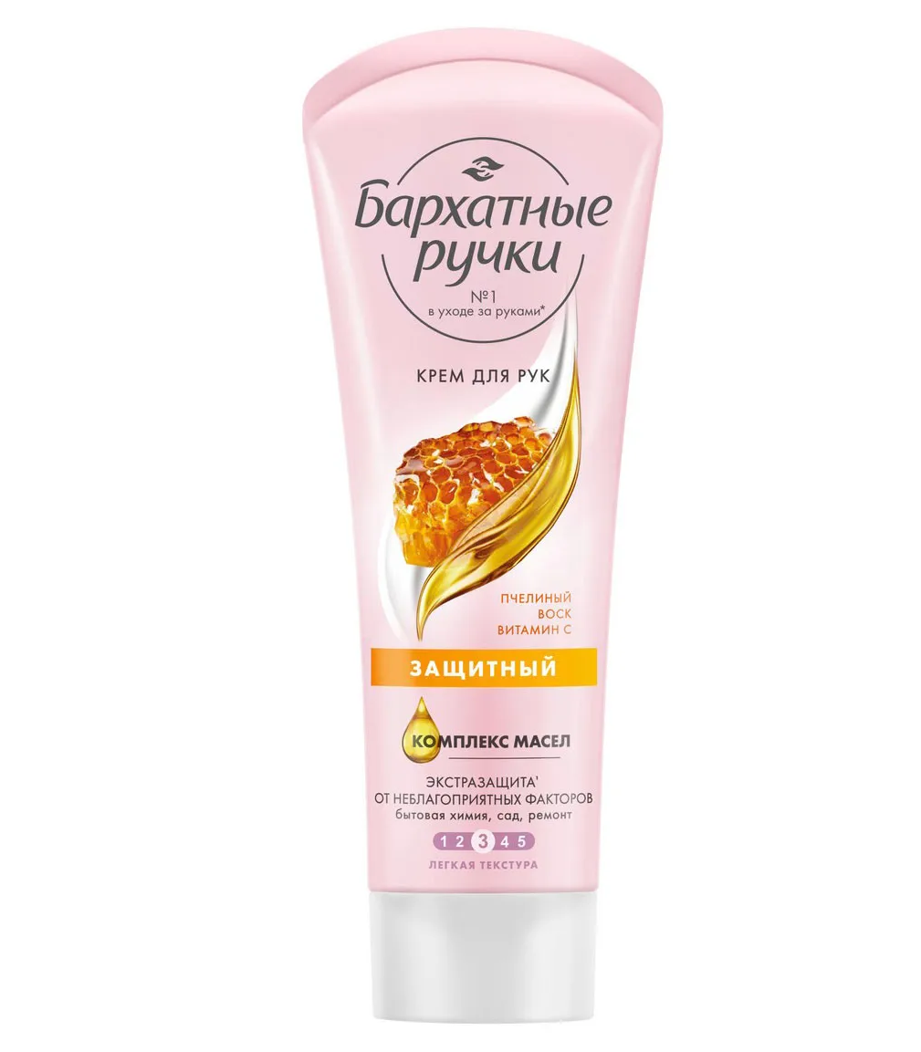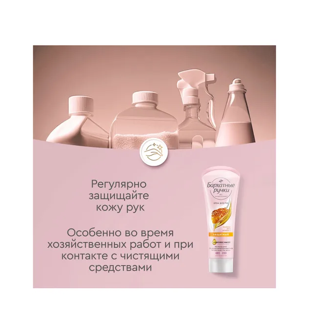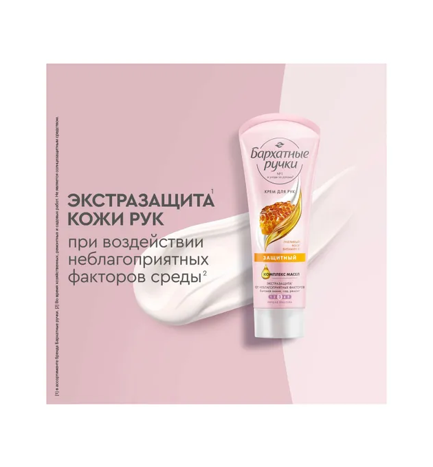 Бренд Бархатные Ручки представляет крем для рук Защитный, разработанный для экстразащиты кожи рук при воздействии агрессивных факторов среды[1]. Крем имеет текстуру средней плотности для повышенной защиты. В составе крема - новейшая формула Silk Oil Elixir с микро-маслами и протеинами шелка, благодаря чему кожа Ваших рук обретет удивительную нежность, гладкость и красоту на целый день.