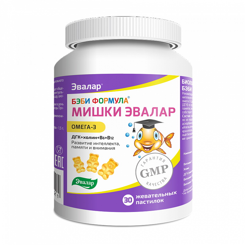 Фармацевтическая компания «Эвалар» представляет современный комплекс для развития интеллекта, памяти и внимания ребенка в виде вкусных мармеладных мишек «Бэби Формула Мишки Омега-3».
