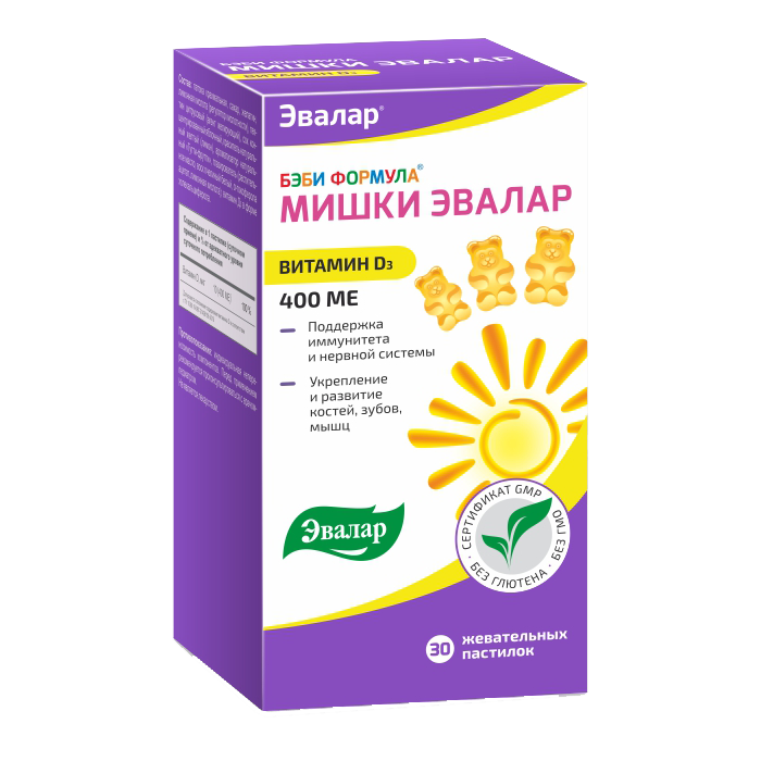 Специально для восполнения недостатка витамина Д3 и поддержания в норме его уровня для детей с 3 лет компания «Эвалар» разработала витаминный препарат Бэби Формула Мишки Витамин Д3 в форме вкусных мармеладных мишек. Каждая пастилка содержит 100% суточной нормы натурального витамина Д3 (также называемого «солнечный витамин») в оптимальной дозировке 400 МЕ.