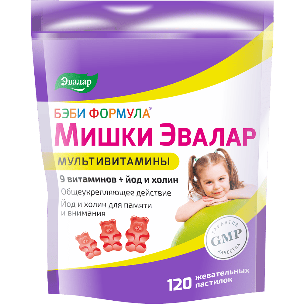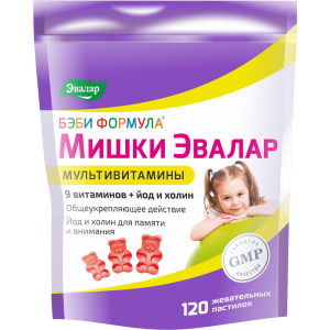 Стоит обратить внимание на витаминные комплексы с богатым составом. Хорошо, если витамины в их составе будут усилены минералами. Мармеладные витаминные пастилки БЭБИ ФОРМУЛА Мишки Мультивитамины от компании «Эвалар» – это один из таких комплексов. Девять витаминов в их составе усилены минералами цинком и йодом, а также холином для памяти, внимания и интеллекта.