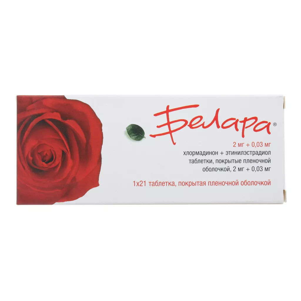 Входящий в состав препарата Белара® хлормадинона ацетат — гестаген, обладающий антиандрогенными свойствами. Его действие основано на способности замещать андрогены на специфических рецепторах, исключая и ослабляя эффект эндогенных и экзогенных андрогенов. Индекс Перля равен 0,291–0,698, в зависимости от того, насколько тщательно женщина соблюдает режим приёма препарата.