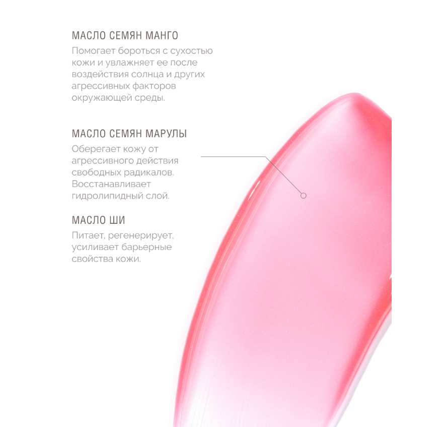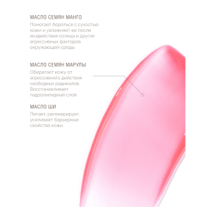 - Масло семян марулы (получаемое из плодов дерева, растущего в Южной Африке. Характеризуется большим количеством жирных кислот и антиоксидантов в форме токоферолов, стеролов и флавоноидов) - оберегает кожу от агрессивного действия свободных радикалов. Восстанавливает гидролипидный слой.