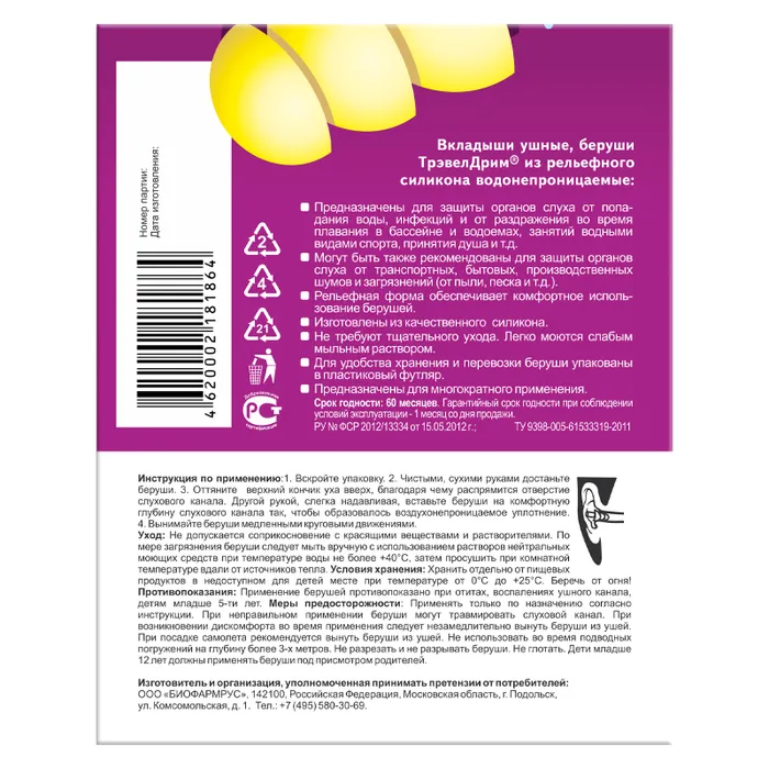 Применять только по назначению согласно инструкции. При неправильном применении беруши могут травмировать слуховой канал. При возникновении дискомфорта во время применения следует незамедлительно вынуть беруши из ушей. Не разрезать и не разрывать беруши. Не глотать. Дети младше 12 лет должны применять беруши под присмотром родителей.