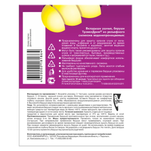 Не допускается соприкосновение с красящими веществами и растворителями. По мере загрязнения беруши следует мыть вручную с использование раствора нейтральных моющих средств при температуре воды не более +40С, затем просушить при комнатной температуре вдали от источников тепла.