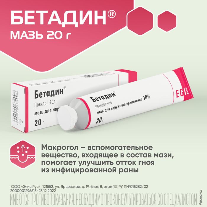 в 1 г мази содержится 100 мг действующего вещества – повидона йода (что соответствует 10,25 мг активного йода), а также вспомогательные вещества: натрия гидрокарбонат, макрогол 400, макрогол 4000, макрогол 1000, макрогол 1500, вода очищенная.