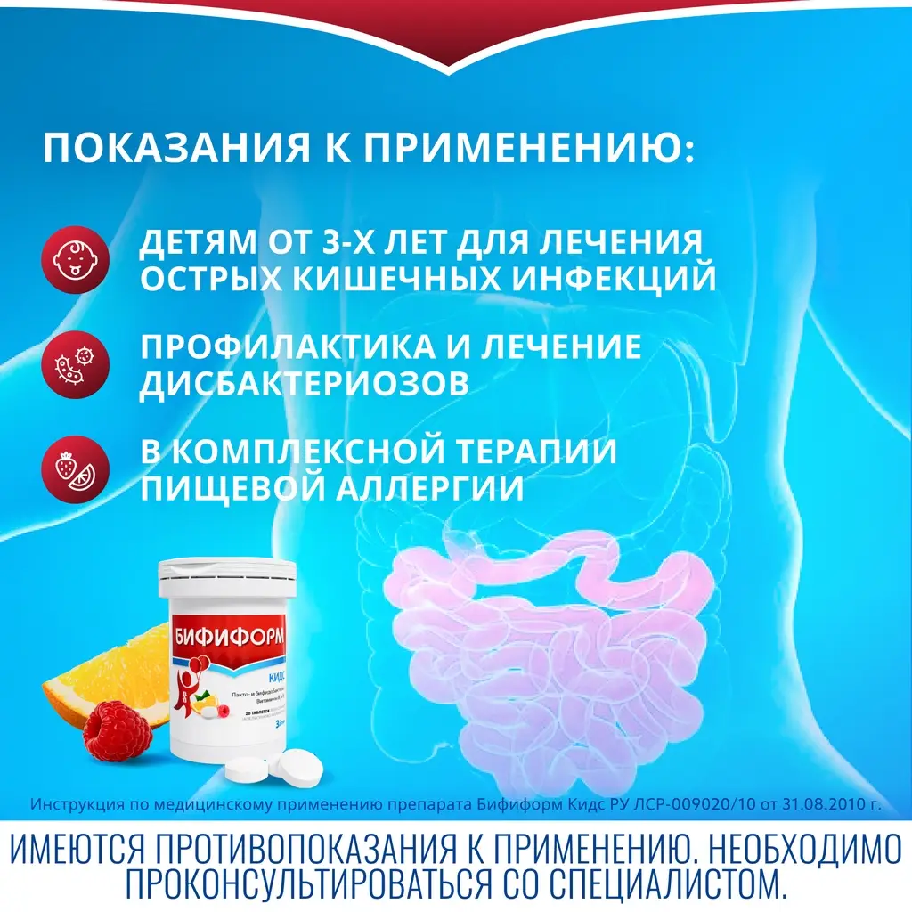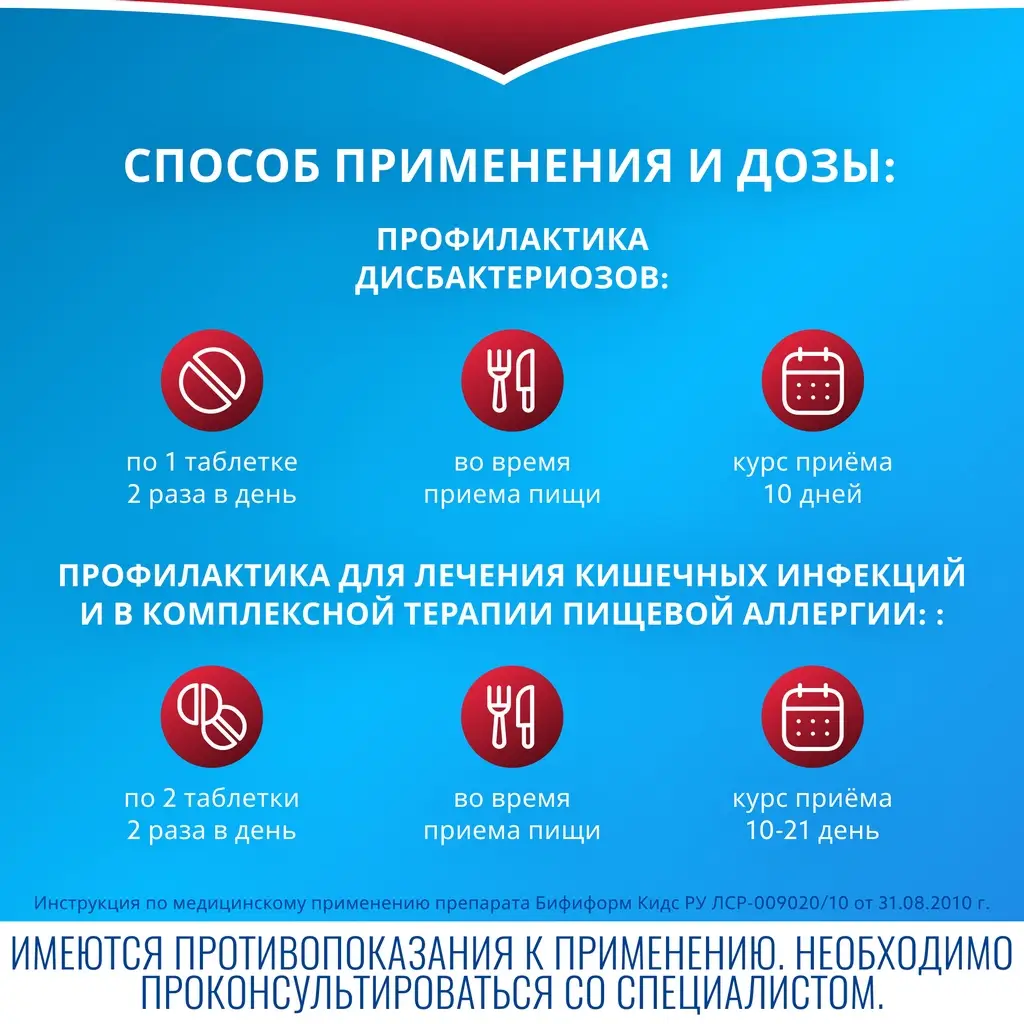 - для профилактики дисбактериозов рекомендуется принимать детям от 3 до 12 лет по 1 таблетке 2 раза в день, тщательно разжёвывая, во время приёма пищи, в течение 10 дней.