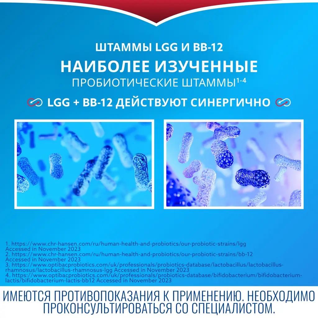 Лактобактерии (LGG) и бифидобактерии (Вb-12), синергически взаимодействуя, поддерживают и регулируют физиологическое равновесие кишечной микрофлоры, повышая устойчивость слизистой оболочки кишечника к болезнетворным микроорганизмам ингибируют транслокацию патогенных бактерий в толстой кишке, обладают антагонистической активностью в отношении многих патогенных и условно-патогенных микроорганизмов, нормализуют показатели иммунитета при его угнетении.