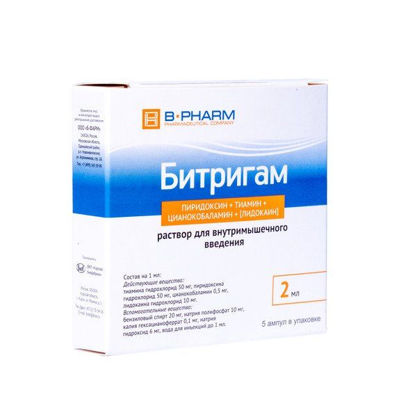 Действующие вещества: тиамина гидрохлорид — 50 мг, пиридоксина гидрохлорид — 50 мг, цианокобаламин — 0,5 мг, лидокаина гидрохлорид — 10 мг