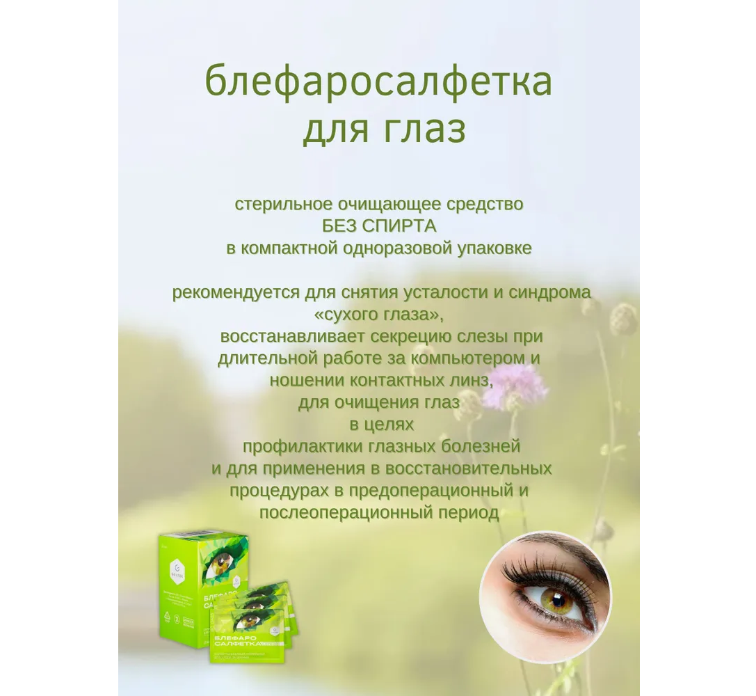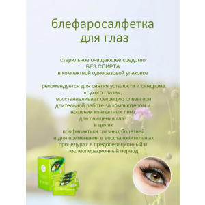 Медицинское изделие, без содержания спирта. Салфетки для век и глаз. Эффективное стерильное очищающее средство в компактной одноразовой упаковке. Рекомендуется для очищения в целях профилактики глазных болезней и для применения в восстановительных процедурах в послеоперационный период.
