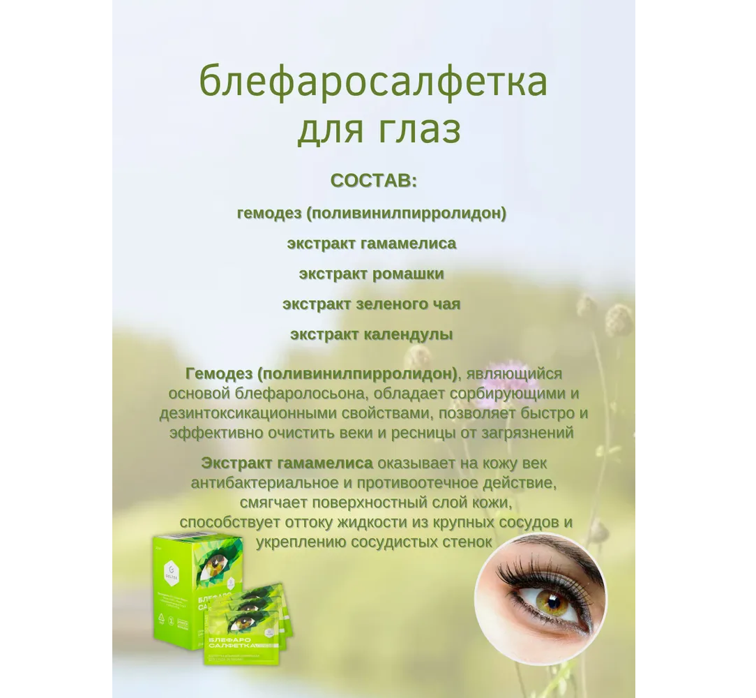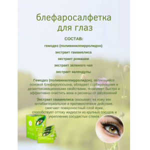 - Поливинилпирролидон обладает сорбирующими и дезинтоксикационными свойствами, благодаря которым Блефаросалфетки быстро и эффективно очищают веки и ресницы от загрязнений.