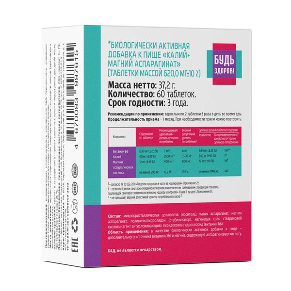 Будь Здоров! Калий + Магний аспарагинат таблетки массой 620мг №60