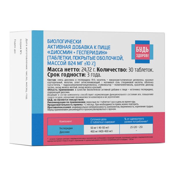 Будь Здоров! Венотоник 450/50 Диосмин+Гесперидин таблетки покрытые оболочкой массой 824мг №30