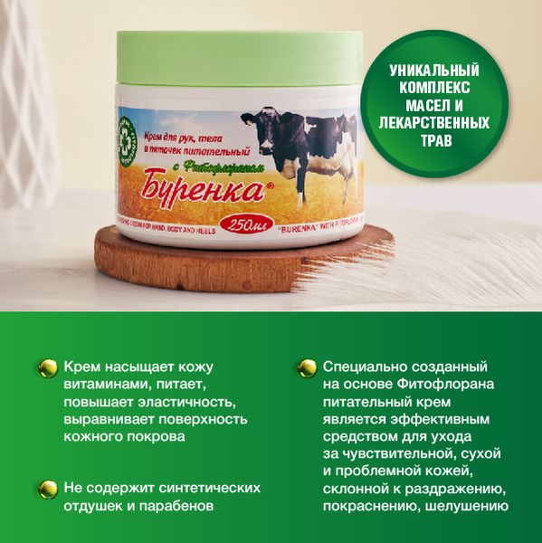 Буренка крем для рук тела и пяточек питательный с Фитофлораном банка 250мл