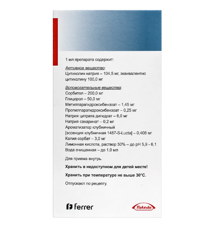 Активное вещество: цитиколин натрия 104,5 мг (эквивалентно 100,0 мг цитиколина)